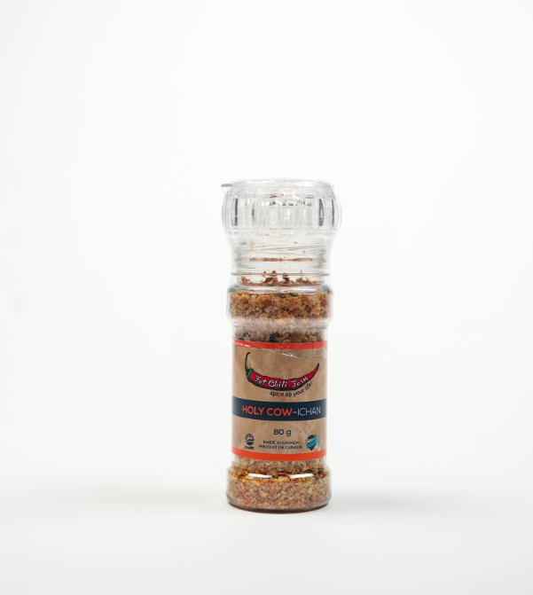 Ignite your taste buds with Holy Chow Ichian, a fiery spicy grinder meticulously blended with dried garlic, Himalayan salt, pepper, cooling mint, and chili peppers ranging from 4 to 6 in intensity. Elevate any dish with this zesty, flavorful mix.