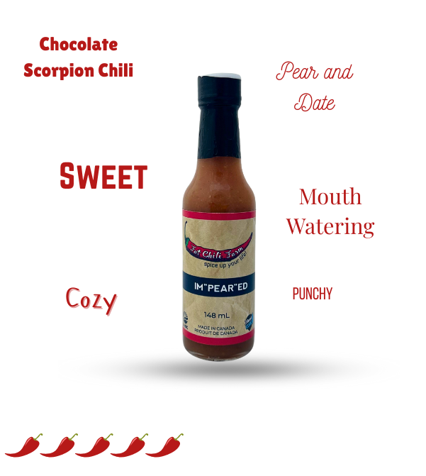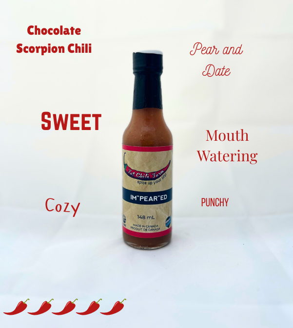 Im'Pear'ed is a handcrafted hot sauce from Fat Chili Farm, made with chocolate Jamaican chili peppers grown right on our farm in Cobble Hill. This unique blend brings together the rich sweetness of pear and date vinegar, smooth Canadian maple syrup, and the warm spice of ginger and cinnamon. A splash of rice vinegar adds brightness, while Himalayan salt enhances every layer. Smoky, sweet, and just the right amount of heat, I'm'Pear'ed is perfect for glazing meats, spicing up vegetables, or adding bold flavor to your favorite dishes.